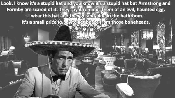 Even all those years later, Bogey feared that Formby and Armstrong were always lurking nearby and took to wearing a sombrero hat that they both feared to keep them away.