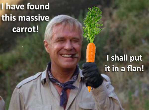 A large military jeep, pulling a huge artillery piece behind it in a trailer, cruises down a road on its way to eliminate what little resistance exists in the village. The trailer hits an improvised explosive made from jelly tots and celery and flips up in the air, landing with a crash on top of the jeep. The jeep spins wildly out of control and eventually screeches to a halt.